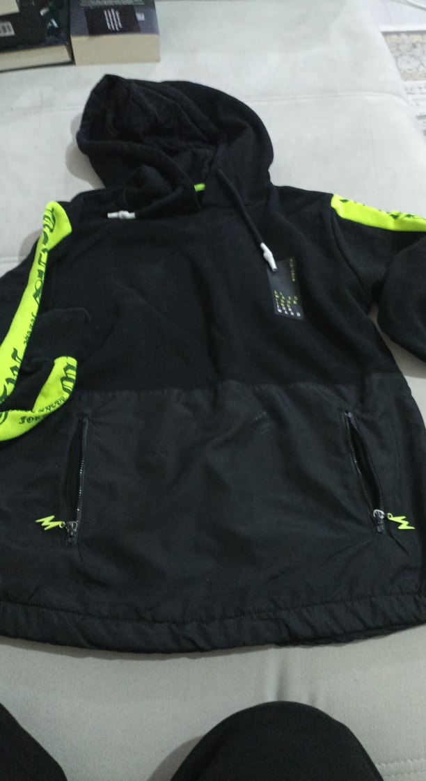 Erkek çocuklar için kapüşonlu, uzun kollu ve bol kesim bir sweatshirt. Siyah kumaş ve neon renkli baskılı detaylar ile zipli cepler bulunur.