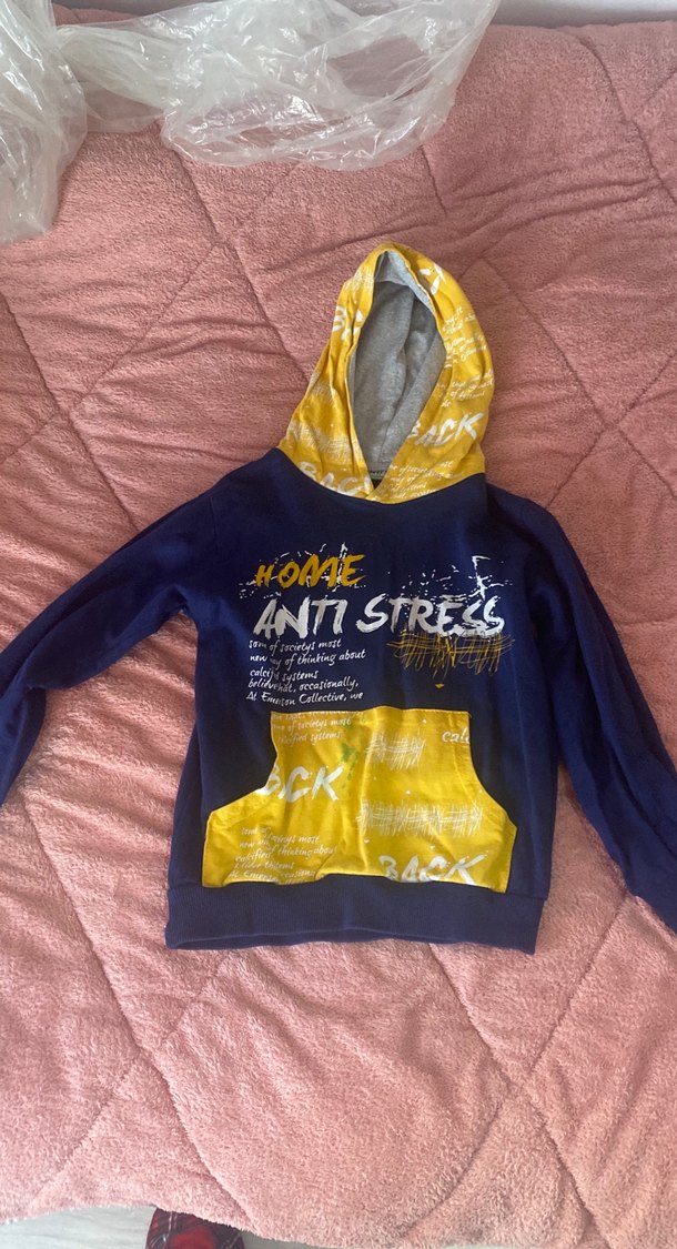 Erkek çocuklar için kapüşonlu, uzun kollu, bol kesim sweatshirt. Sarı ve lacivert renklerde baskılı, yumuşak ve sıcak örme kumaştan üretilmiştir. Ön cepli.