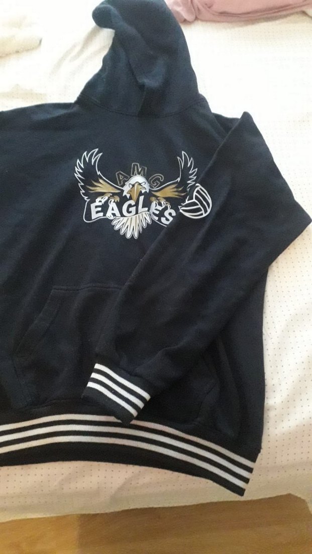 Siyah kapüşonlu sweatshirt, bol kesim ve elastik manşetlere sahip. Önünde baskılı kartal deseni bulunur. Rahat ve sıcak tutan yumuşak kumaş içerir.