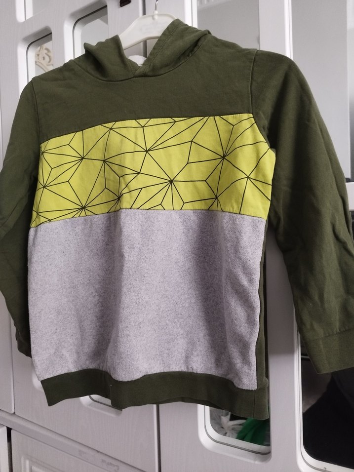 Kapüşonlu ve uzun kollu, bol kesim erkek çocuk sweatshirtü. Yeşil, sarı geometrik desenli ve gri renk bloklu, yumuşak sentetik kumaştan örme dokuda, rahat sokak stili için uygundur.