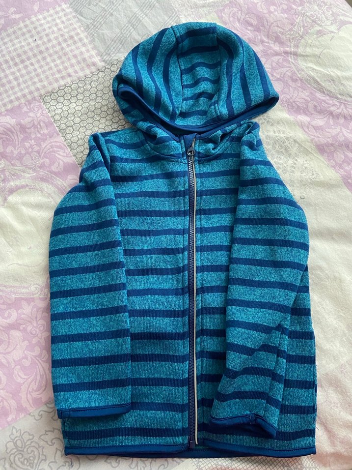 Erkek çocuklar için kapüşonlu, fermuarlı ve fitted kesime sahip triko ceket. Mavi ve gri çizgili, yumuşak dokulu kumaştan üretilmiştir. Bi kaç defa kullanıldı