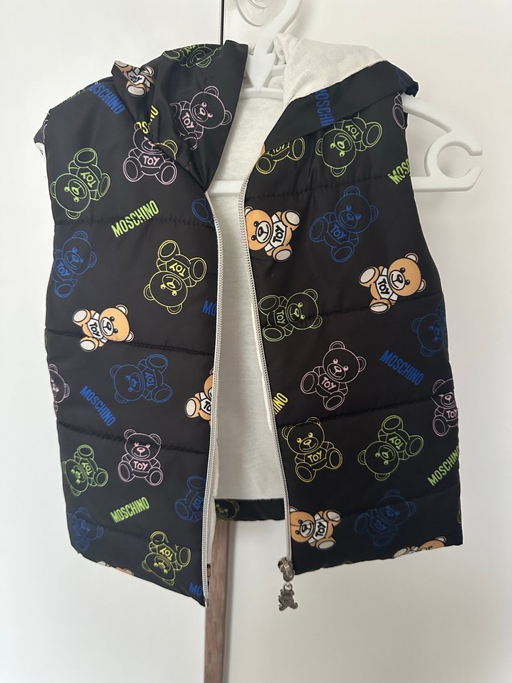 Kapüşonlu, baskılı ayıcık desenli, kolsuz erkek çocuk yeleği. Trendy sokak stili için uygun. 1-2 kez giyildi. 6-18 ay arası giyebilir.