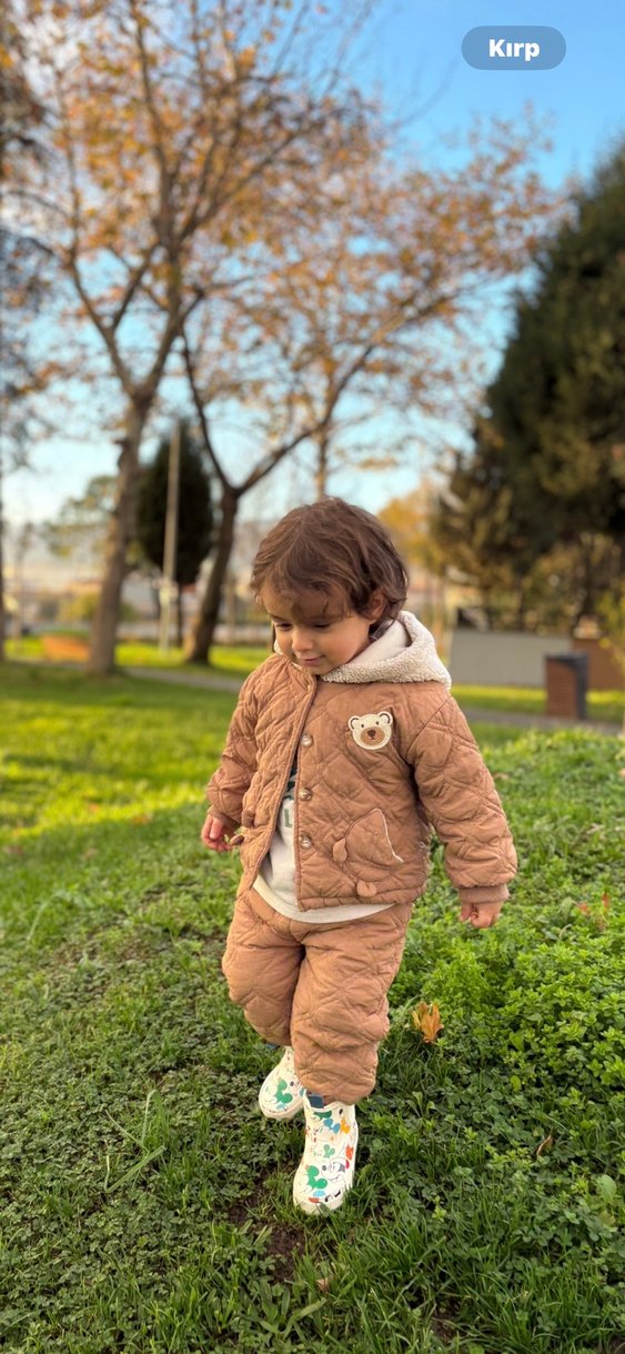 Kahverengi kapitone mont, notched lapel yakalı ve yumuşak, sıcak kumaştan üretilmiştir. Rahat kesim ve göğsünde sevimli ayı patchi bulunur. Yurt dışından alınmıştır sıcak tutar