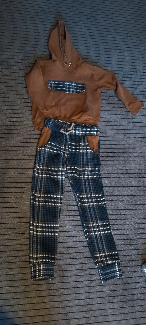Kahverengi, yakası kesik ve kareli cepli üst ile kemerli koyu kareli pantolonlu erkek çocuk eşofman takımı. 3 4 yaş uyumludur renk taba tonlarindadir