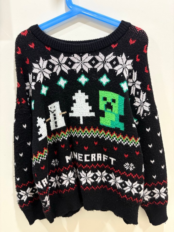 Renkli nakışlı, uzun kollu, yuvarlak yaka, bol kesim örgü kadın kazak. Minecraft temalı desenlerle rahat sokak stili için uygundur.