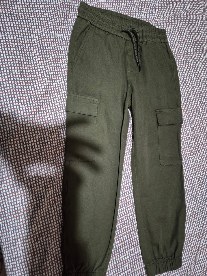 pamuklu, bol kesim, midi boy, haki renkli rahat dış mekan pantolonu.