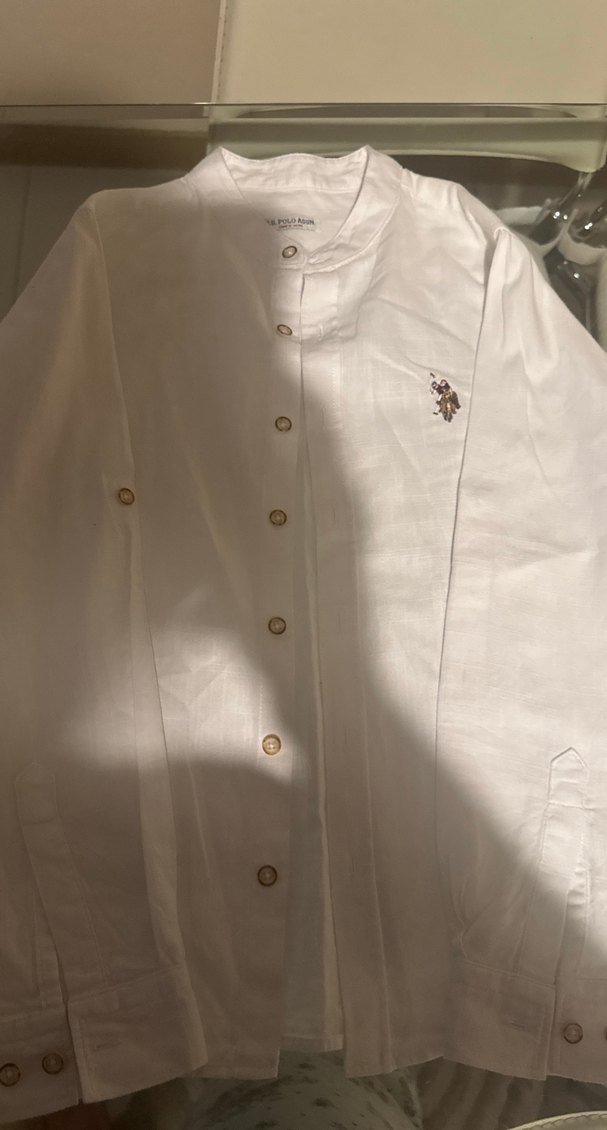Beyaz keten erkek gömleği, kesik yaka ve uzun kollu. Düğmeli, bol kesim ve göğüste küçük logo detaylı. Günlük rahat sokak stili için uygun.