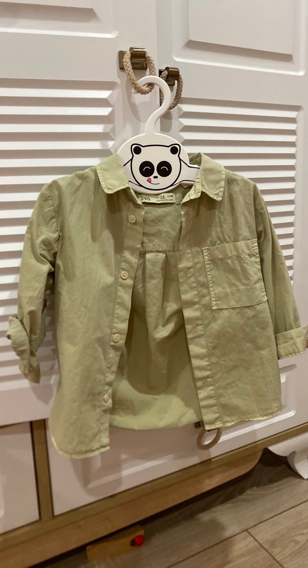 Erkek çocuklar için keten kumaştan, bol kesim, düğmeli, uzun kollu ve yakası kesik detaylı haki 2-3 yaş