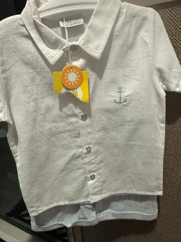 Erkek çocuk keten kumaştan, kısa kollu, yakalı ve düğmeli gömlek. Hafif beyaz renkte, küçük çapa baskılı, rahat kesimlidir. Trendy ve günlük kullanıma uygundur. ⚓