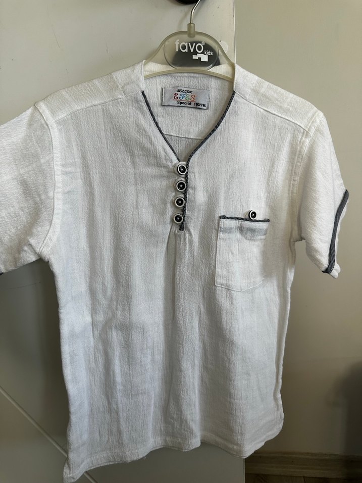 Beyaz keten erkek çocuk gömleği, bol kesim, V yaka ve düğmeli kapama içerir. Kısa kollarda gri detay ve düğmeli cep bulunur. Bohem, trend bir tarz sunar.