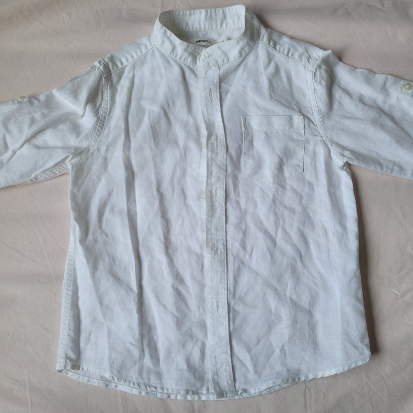 Erkek çocuk keten/pamuk kumaştan, uzun kollu, kıvrılabilir düğmeli, yaka detaylı ve düğmeli gömlek. Rahat kesimi ve sade beyaz rengiyle günlük kullanıma uygundur. Hiç lekesi yok. Yakından bol bol çektim.