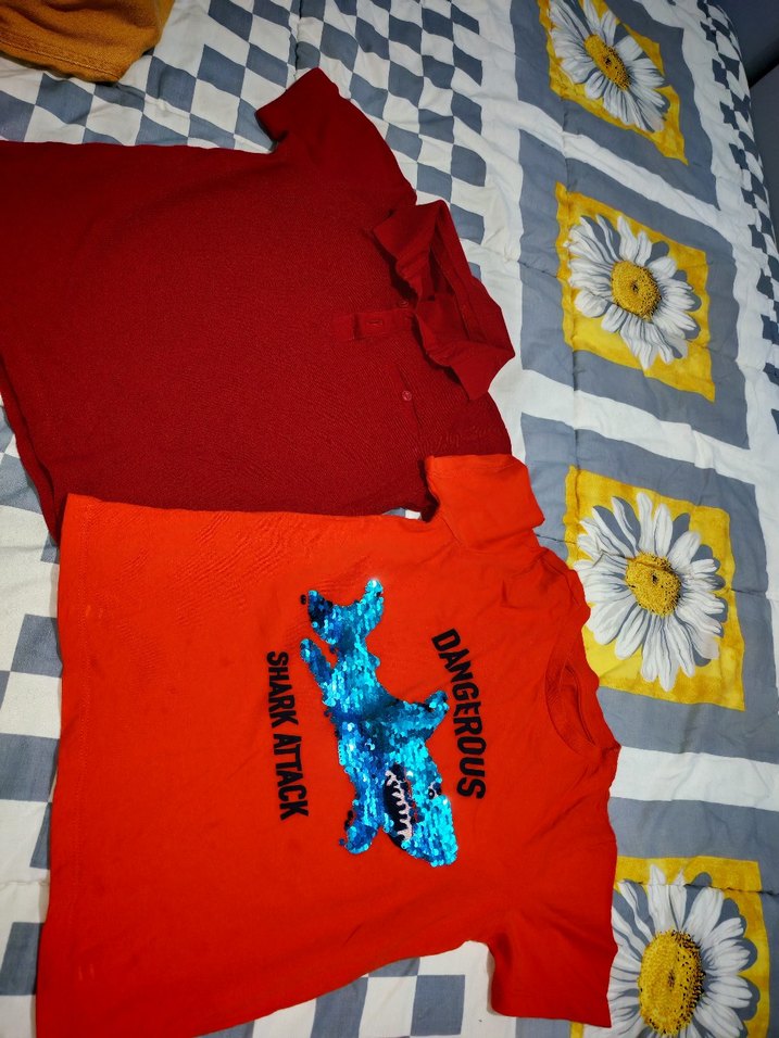 Erkek çocuklar için yakalı, kısa kollu ve renkli baskılı, fit kesim kırmızı tişört. Üzerinde ters çevrilebilir pullu köpekbalığı deseni ve cırt cırt detay bulunur.