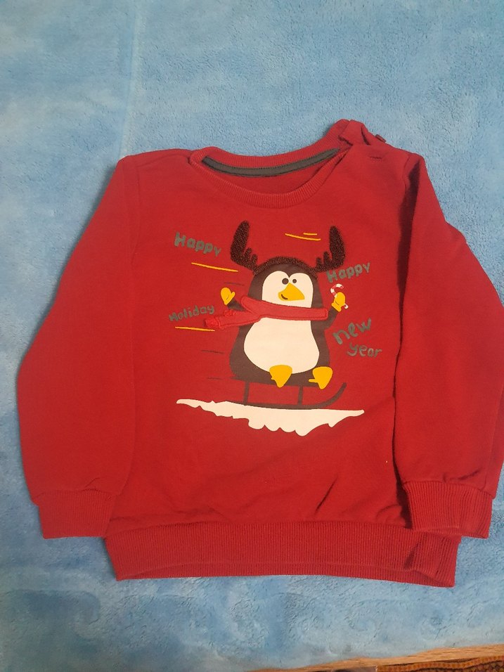 Erkek çocuklar için uzun kollu, yuvarlak yaka ve renkli penguen baskılı kırmızı, yumuşak örgü kumaştan sweatshirt. ❄️