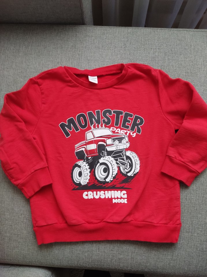 Kırmızı renkli, uzun kollu ve yuvarlak yakalı erkek çocuk sweatshirtü. Renkli baskılı canavar kamyon ve 'MONSTER CRUSHING MODE' yazısı bulunur. Rahat kesim, yumuşak ve sıcak kumaş.