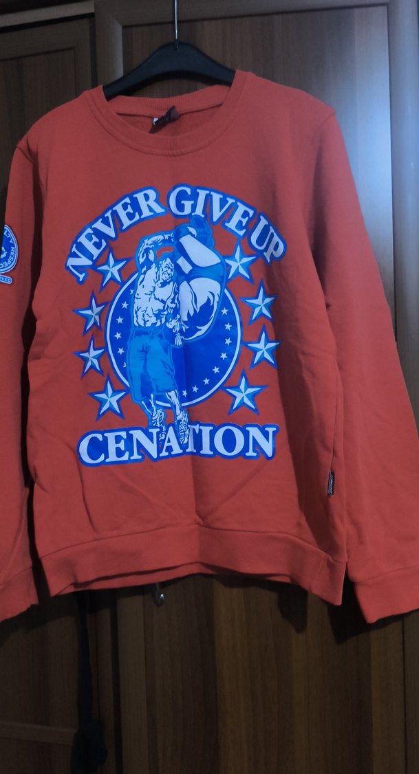 Kırmızı erkek çocuk sweatshirt, uzun kollu ve yuvarlak yakalıdır. Renkli baskısı "NEVER GIVE UP CENATION" yazısını taşır ve cırt cırtlı detay içerir. Yumuşak ve sıcak kumaştan yapılmıştır.