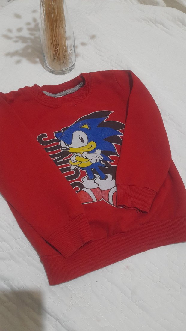 Uzun kollu, bisiklet yaka, renkli Sonic baskılı kırmızı, erkek çocuk sweatshirtü. Yumuşak örme kumaştan, trend sokak stili için uygun.