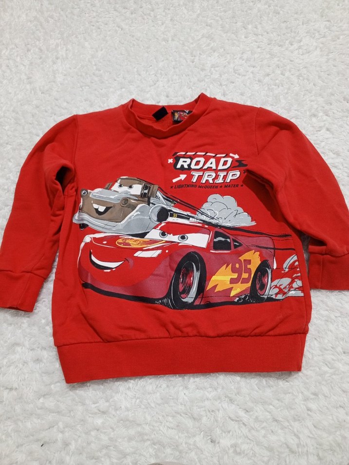 Uzun kollu, yuvarlak yaka ve bol kesim kırmızı erkek çocuk sweatshirtü. Yumuşak ve sıcak kürk dokulu kumaştan, renkli Cars baskılı ve tokalı detaylıdır.