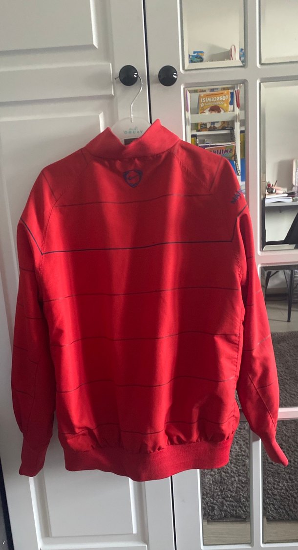 Erkek çocuklar için kırmızı parlak renkte, dik yakalı ve düğmeli, yumuşak kumaştan üretilmiş, sokak tarzı uyumlu ceket. Desensiz ve vücuda oturan kesime sahiptir.