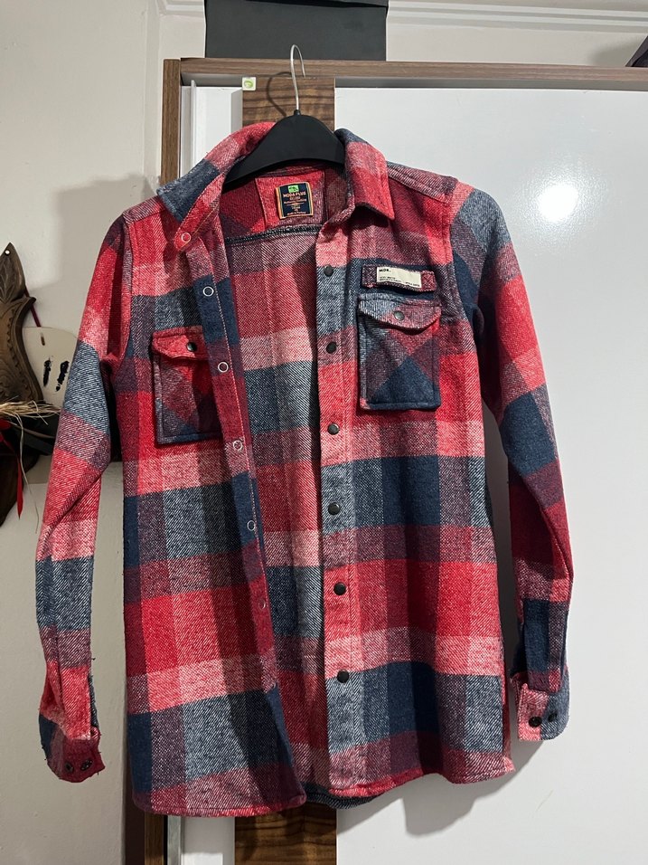 Erkek çocuk için yün kumaştan yapılmış, koyu kırmızı ekose desenli, düğmeli, uzun kollu, bol kesim gömlek. Notlu yakalı, sokak stili için uygun.