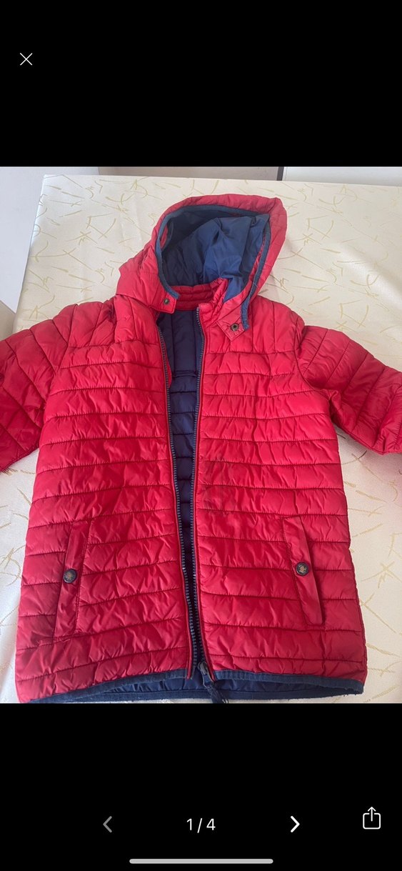 Koyu kırmızı renkli, fermuarlı ve kesimli erkek çocuk montu. Notched lapel yakaya sahip, sıcak ve yumuşak kumaştan üretilmiştir. Kolunda dikiş izi mevcuttur