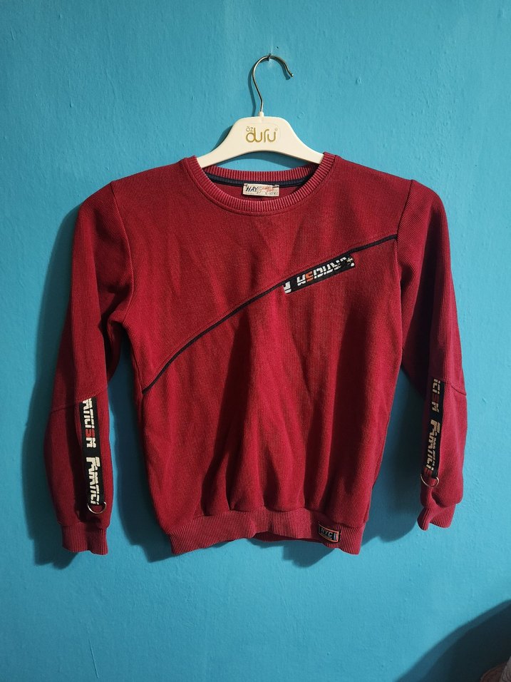 Erkek çocuk için uzun kollu, yuvarlak yakalı, bol kesim kırmızı sweatshirt. Yumuşak ve sıcak kumaştan, fermuarlı detaylı, sokak stili uyumlu.