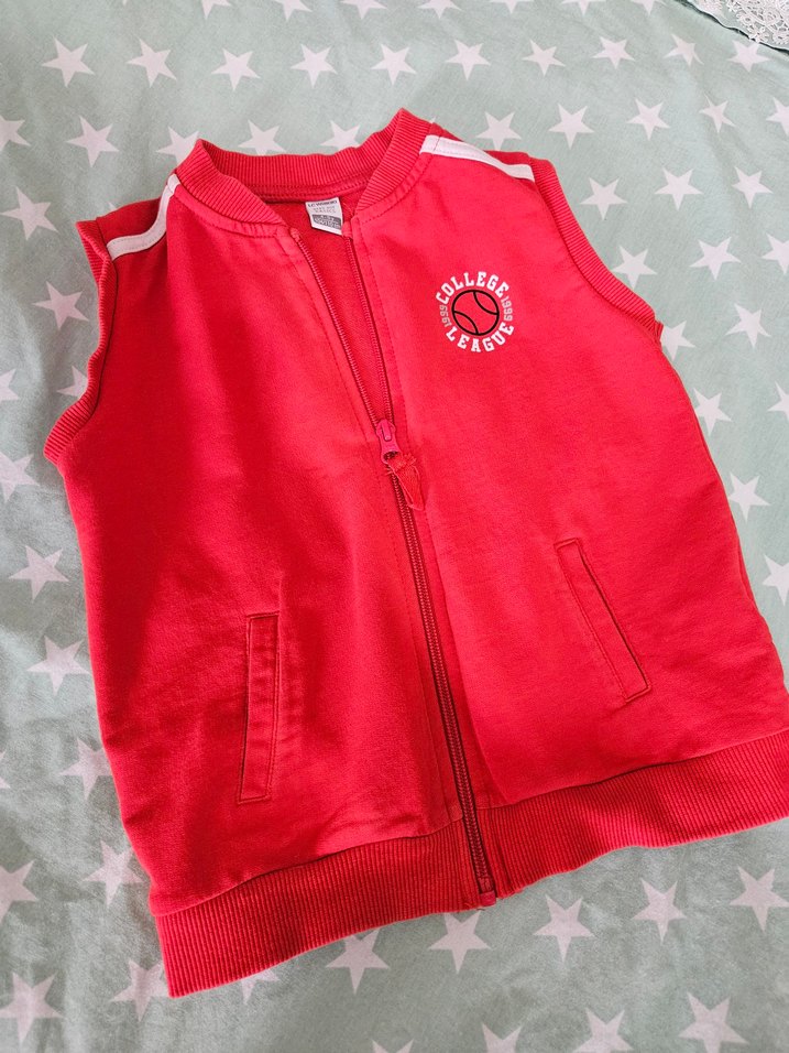 Erkek çocuklar için fermuarlı, fitted kesim kırmızı yelek. Yumuşak ve sıcak kumaştan, kolsuz ve askısız yakalıdır. İki ön ceplidir, sade ve renkli tasarımda.