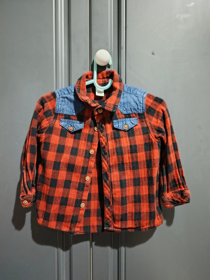 Erkek çocuklar için kırmızı kareli desenli, omuz ve ceplerinde denim detaylı gömlek. Yaka düğmeli, uzun kollu ve bol kesim sokak stili.