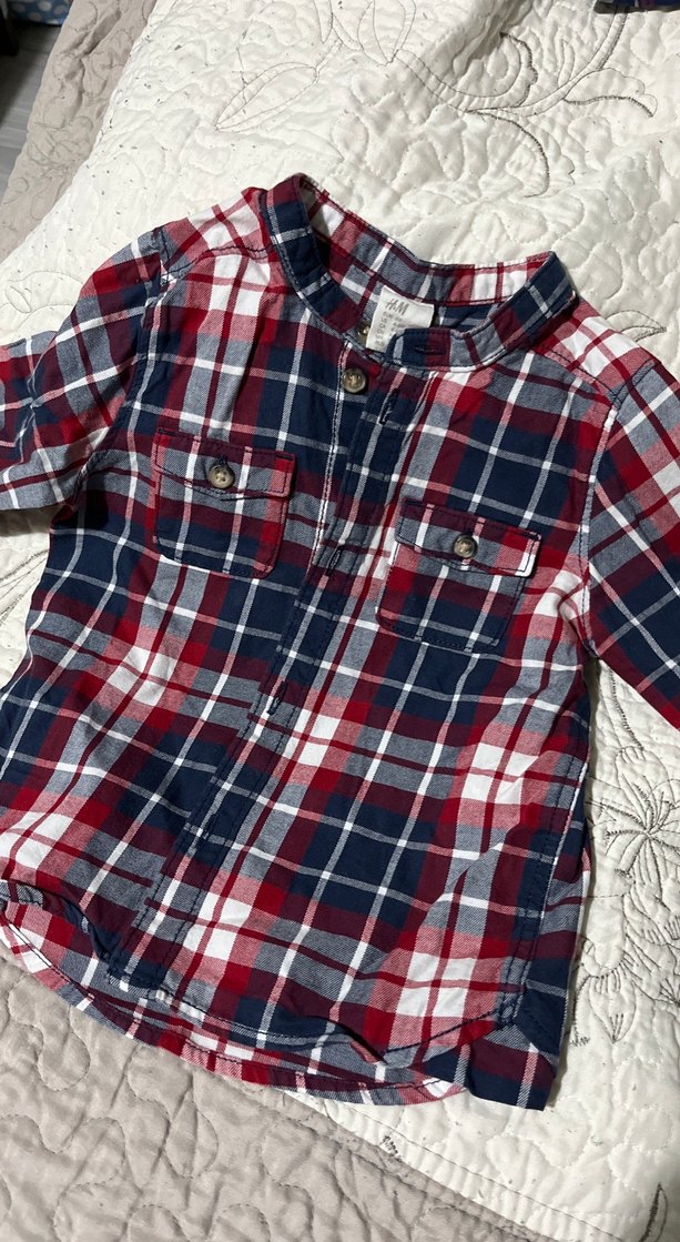 Erkek çocuklar için kırmızı ve koyu renk kareli, pamuklu, düğmeli cepli, uzun kollu gömlek