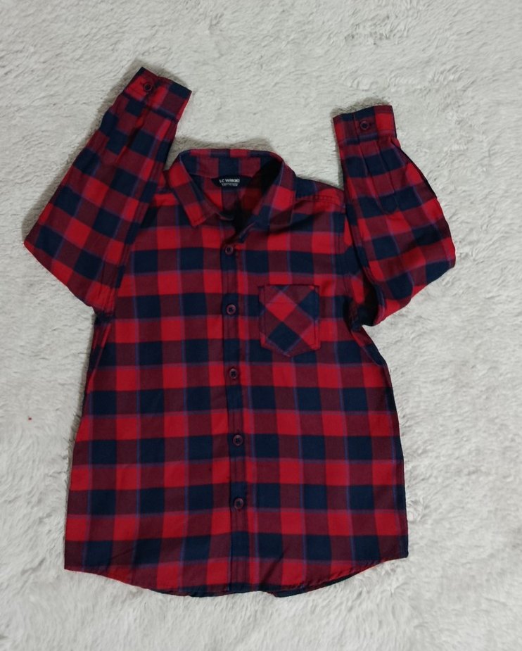 Erkek çocuklar için renkli kırmızı kareli desenli, yakalı ve düğmeli önü olan gömlek. Uzun kollu, bol kesim, yumuşak ve sıcak kumaştan, sokak tarzı için uygun.
