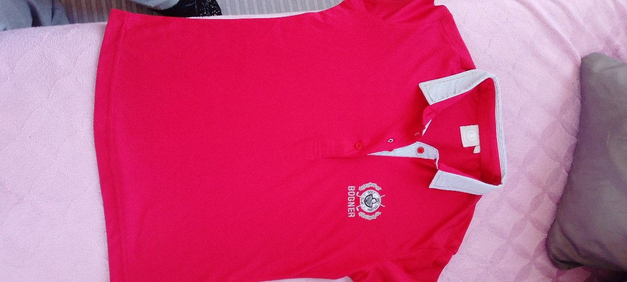 erkek çocuk kırmızı kısa kollu polo tişört, yakalı ve düğmeli. Parlak sentetik kumaştan, 'BOGNER' baskılı logo bulunur.