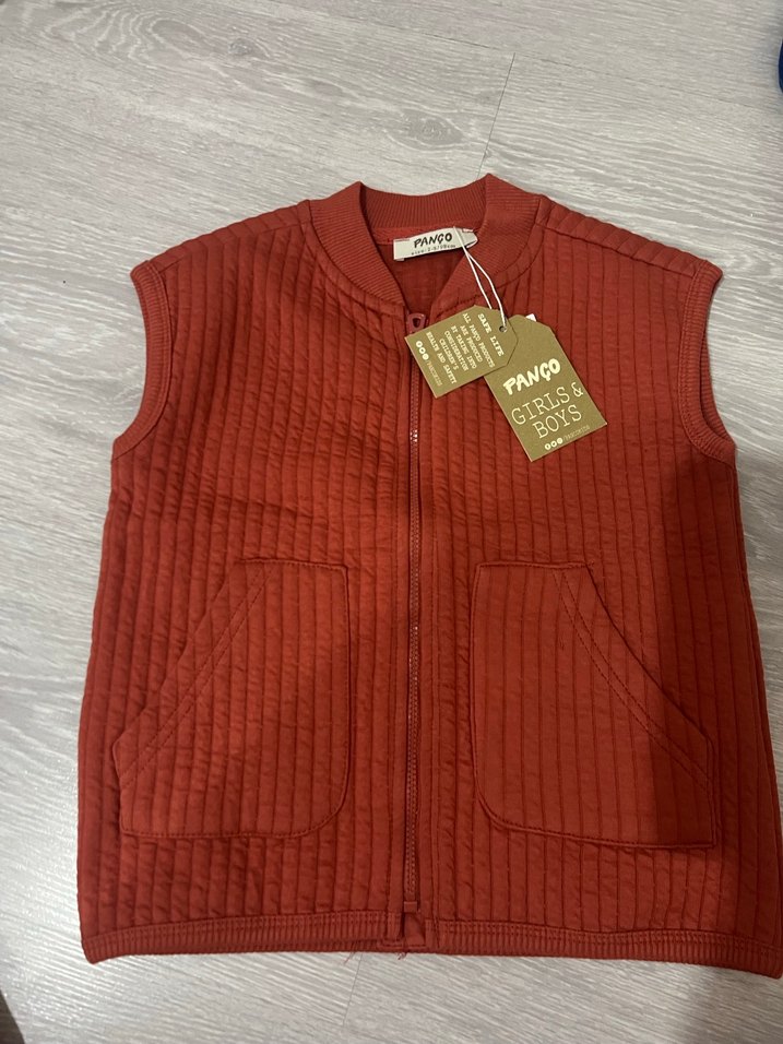 Keten kumaştan yapılmış, kolsuz ve fitted kesimli kırmızı erkek çocuk yeleği. Önünde fermuar ve iki cep bulunur. Sokak stiline uygun rahat bir parça.