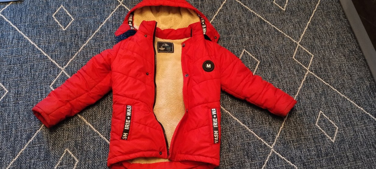 5-8 yaş arası uygundur.Kırmızı renkli, kürklü iç detaylı ve renkli baskılı desenlere sahip, kesimli erkek çocuk streetwear montu. Notch yaka ve rahat bir görünüm sunar.