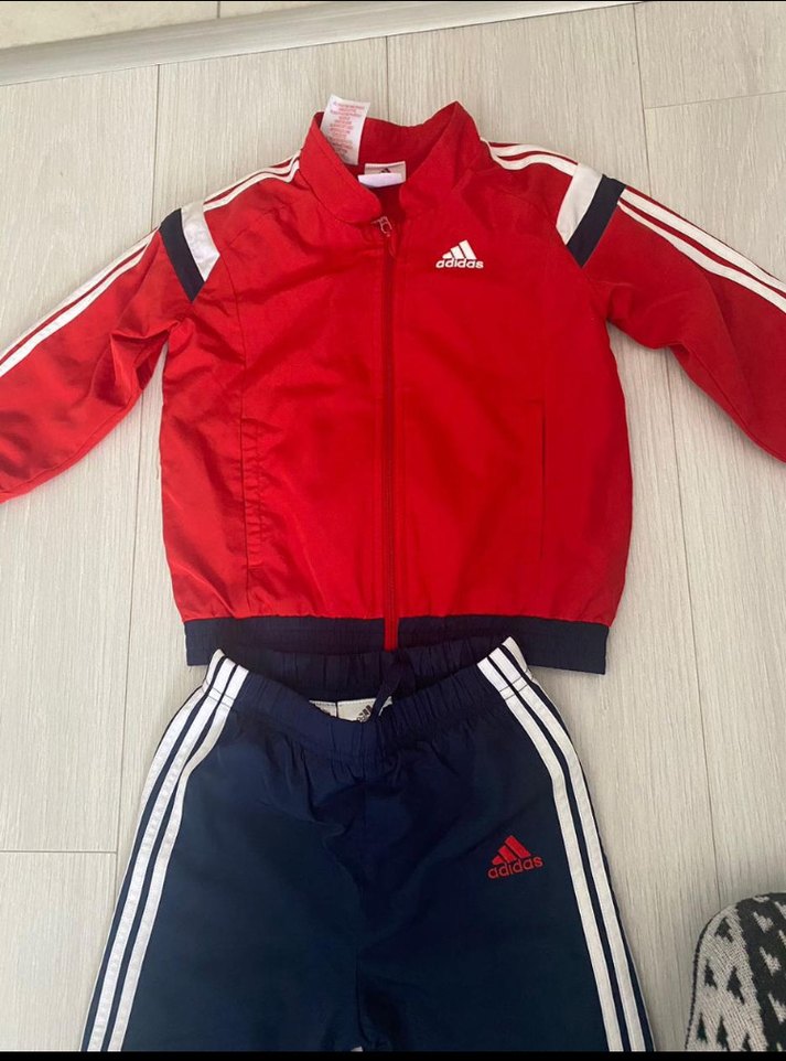 Erkek ve kız çocuklar için kırmızı üst ve lacivert alt parçadan oluşan, beyaz şerit detaylı, fit kesim eşofman takımı. Üst parça bisiklet yaka çok güzel bir eşofman severek giyindik benim oğlum 3 yaşa kadar giyindi 15 kiloydu