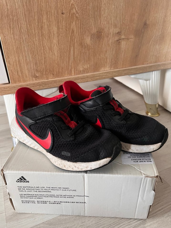 Koyu renkli baskılı tasarıma sahip, kırmızı detaylı ve cırt cırtlı erkek çocuk spor ayakkabısı, kauçuk tabanlıdır.