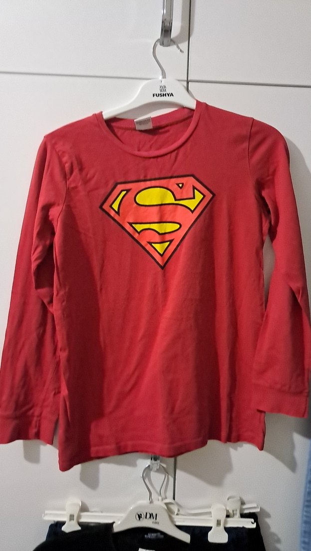 Erkek çocuk için kırmızı, uzun kollu, Süpermen baskılı pamuksu kumaştan, dar kesim tişört. Marka: DeFacto ister pijama niyetine ister swit olarak kullanin