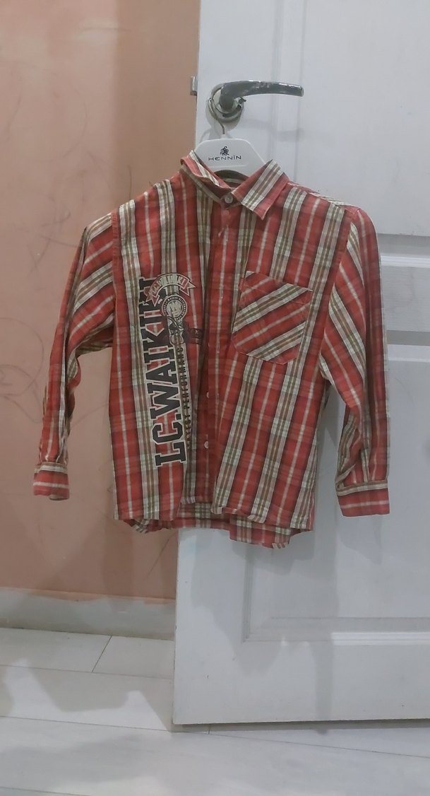 Erkek çocuk için koyu kırmızı kareli, uzun kollu, düğmeli ve yakalı gömlek. Göğüs cebine ve yan baskıya sahip, rahat kesim ve tekstil kumaştan üretilmiştir.