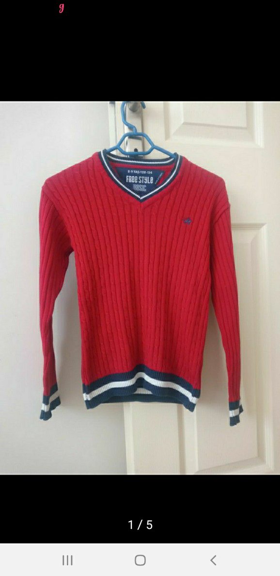 Kırmızı renkli, uzun kollu, V yaka ve fitted kesim erkek çocuk triko kazak. Kollarında ve etek ucunda renkli çizgiler bulunur. Hiç giyilmedi,Ölçülerini sorabilirsiniz ✨ Ertesi gün kargolanır ” Dolabımda fazlalık vardır,ihtiyacı olana Tüm ürünleri uygun fiyata veriyorum ️”**