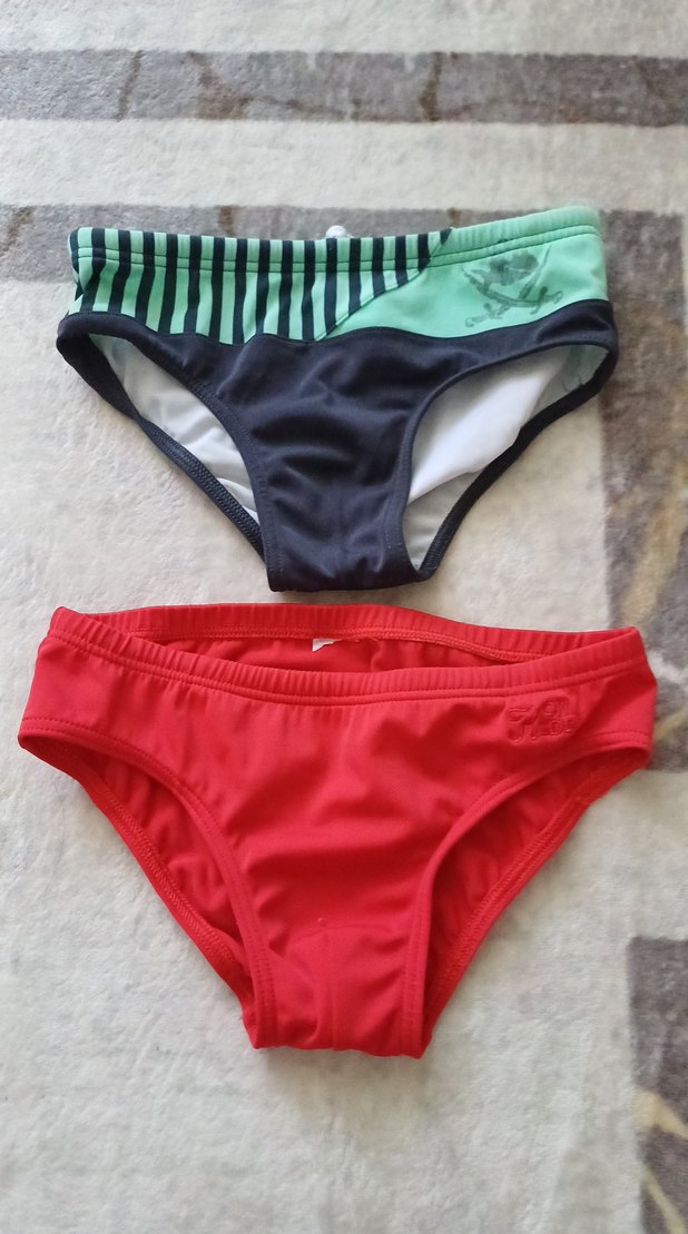 İki adet erkek çocuk mayo; biri kırmızı diğeri siyah-yeşil çizgili, rahat kesim ve sade tasarımlı. ikili fıyattır
