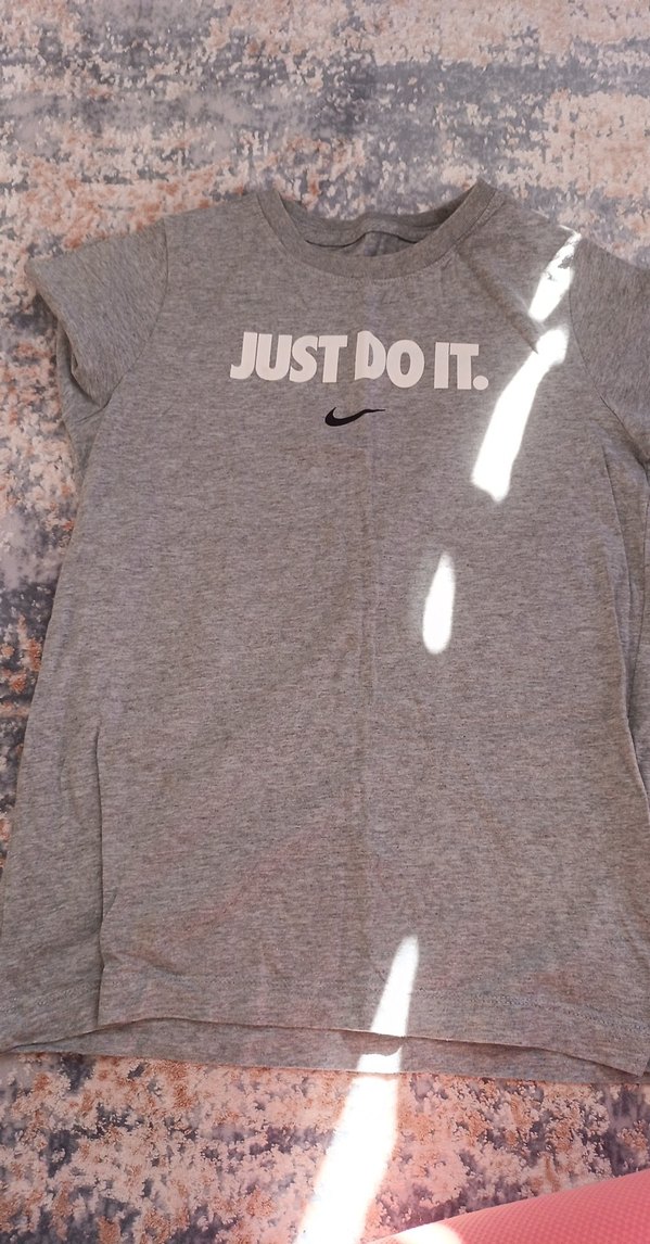 Gri, kısa kollu, yuvarlak yakalı ve bol kesim erkek çocuk tişörtü. Yumuşak sentetik kumaştan, "JUST DO IT." baskılıdır. Sokak stili için uygun.