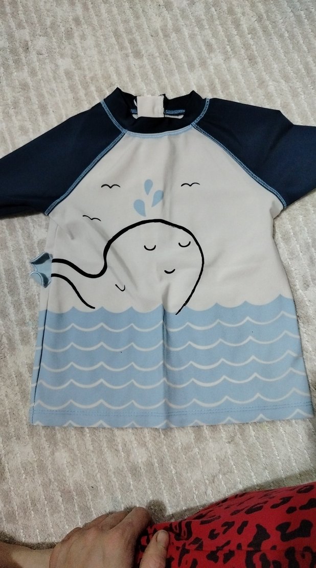 Erkek çocuklar için kısa kollu, balina ve dalga desenli baskılı mayo üstü. Suya dayanıklı, yumuşak kumaştan üretilmiştir.