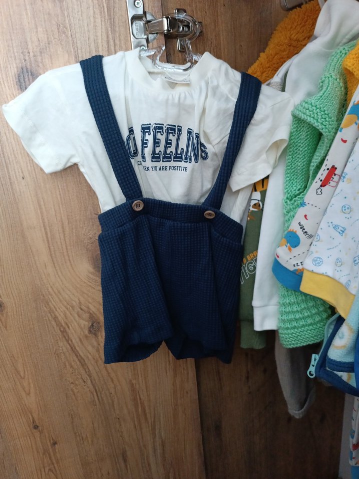 Erkek çocuk kısa kollu, bisiklet yaka ve baskılı pamuklu kumaştan yapılmış tulum. Örgü askılar sokak stili dokunuşu katıyor. Beyaz, gri ve lacivert detaylıdır.