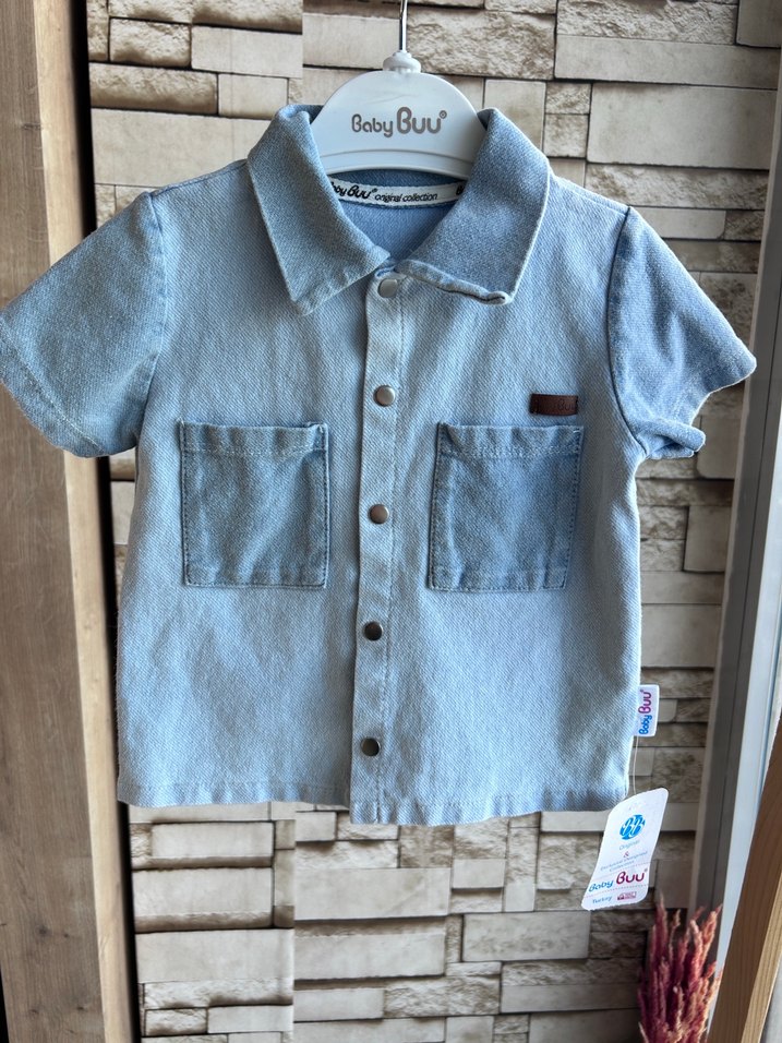 Kısa kollu, yakalı ve düğmeli erkek çocuk takım. Yumuşak denim kumaştan, regular fit ve iki ön cepli. Mavi-gri renkte, BabyBuu markalı. 6-9/9-12 ay beden seçenekleri mevcuttur.