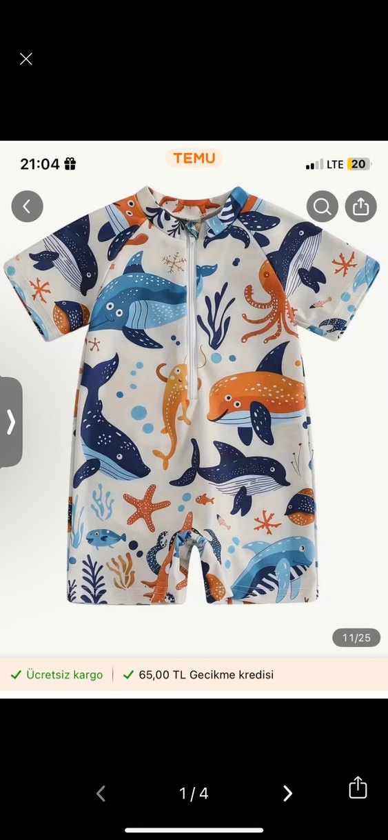 Kısa kollu, ön fermuarlı erkek çocuk mayo, pastel tonlarda deniz canlıları desenlidir.