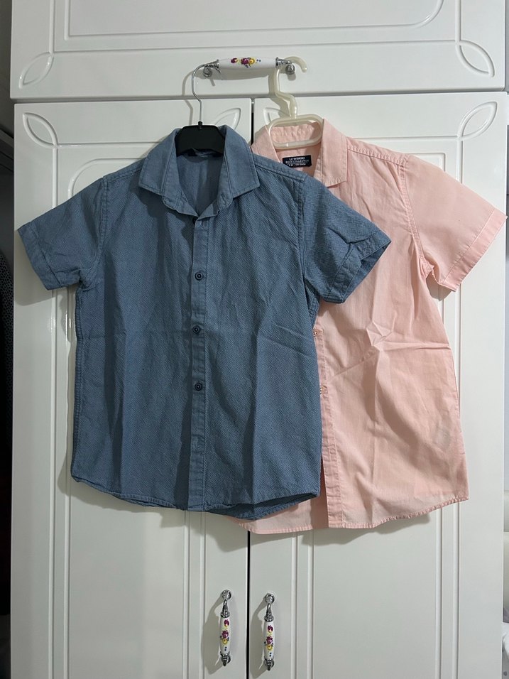 Erkek çocuklar için pastel pembe ve mavi renklerde, kısa kollu, düğmeli ve yakalı bol kesim denim gömlekler. Rahat ve günlük tarz.