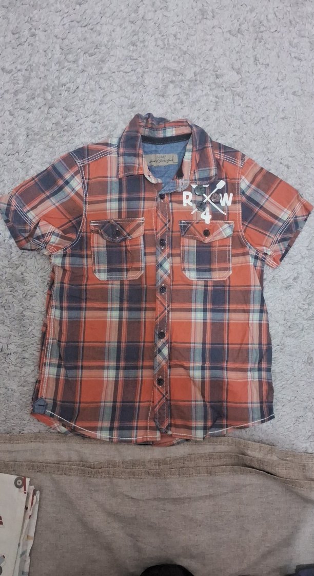 Erkek çocuk kısa kollu, yakalı ve bol kesim gömlek. Düğmeli önü ve kahverengi-gri tonlarda ekose desenli, tekstil malzemeden üretilmiştir. 3 yaş içindir.