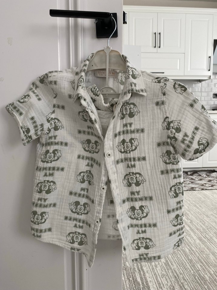 Erkek çocuklar için loose fit, yakalı, düğmeli kısa kollu gömlek. Yumuşak keten kumaştan, gri tie-dye desenli ve bohem tarzda baskılar içerir.
