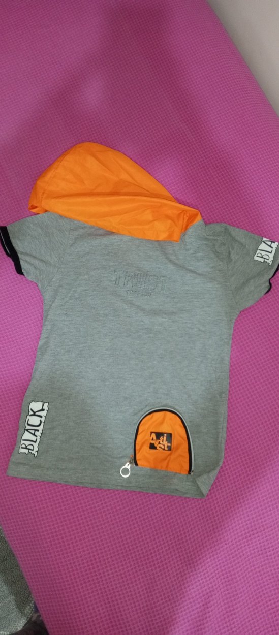 Erkek çocuk için kısa kollu, bisiklet yaka gri tişört. Turuncu kapüşonlu, baskılı ve fermuarlı cep detaylı, rahat kesim.