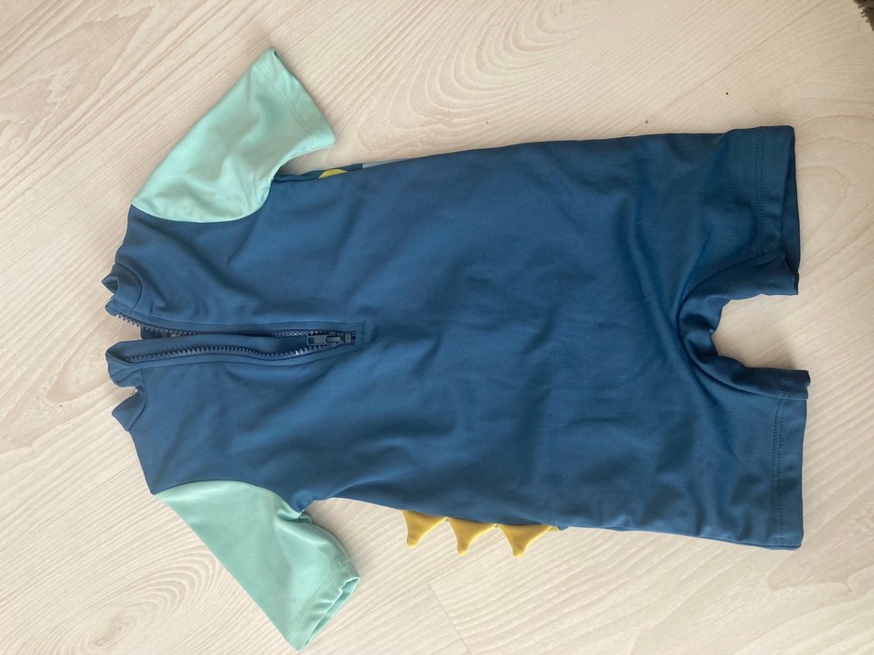 Kısa kollu, pastel mavi renkli, baskılı erkek çocuk mayosu. Arka fermuarlı ve yumuşak dokulu kumaştan yapılmıştır.