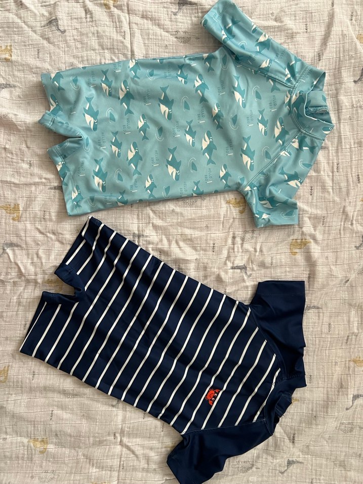 Bu set, erkek çocuklar için iki kısa kollu mayo üstü içerir. Biri açık mavi ve balık desenli, diğeri lacivert beyaz çizgili ve küçük kırmızı yengeç detaylıdır. ♂️