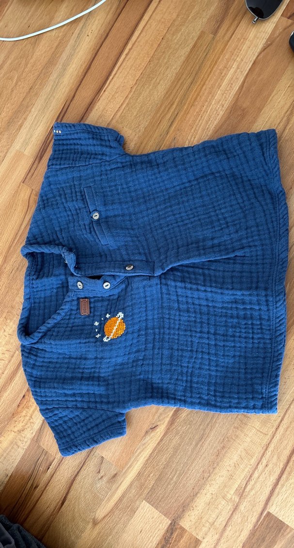 Erkek çocuklar için kısa kollu, keten kumaştan, düğmeli ve nakış detaylı, bol kesim lacivert gömlek. Trendy ve rahat bir görünüm sağlar.